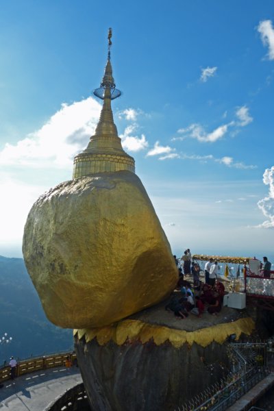 Plein bij de Kyaiktiyo Gouden rots pagode met de taguntaing, de kolom met beelden van Thagyamin, de koning van de nats (geesten)